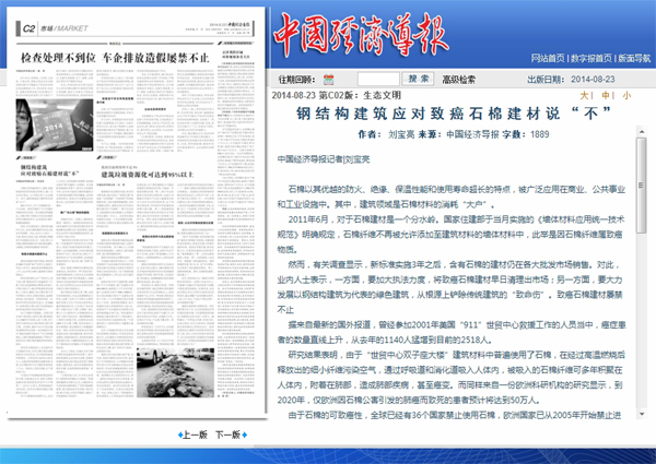 2014年8月23日,《中國(guó)經(jīng)濟(jì)導(dǎo)報(bào)》第C02版《生態(tài)文明》報(bào)道:《鋼結(jié)構(gòu)建筑應(yīng)對(duì)致癌石棉建材說(shuō)“不”》。