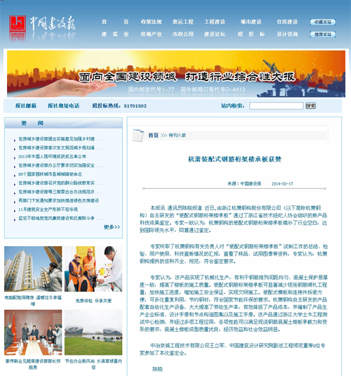 2014年2月17日,《中國建設(shè)報(bào)》報(bào)道:《杭蕭裝配式鋼筋桁架樓承板獲贊》