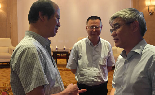 杭蕭鋼構(gòu)集團(tuán)總裁張振勇(左)、副總裁王愛民(中)向江西省副省長(zhǎng)李貽煌(右)匯報(bào)杭蕭鋼構(gòu)發(fā)展歷程