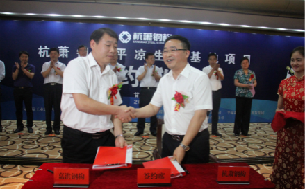 8月31日,杭蕭鋼構(gòu)股份有限公司(以下簡(jiǎn)稱(chēng):杭蕭鋼構(gòu))與甘肅嘉洪鋼結(jié)構(gòu)工程有限公司(以下簡(jiǎn)稱(chēng):甘肅嘉洪鋼結(jié)構(gòu))戰(zhàn)略合作簽約儀式在甘肅省平?jīng)鍪信e行。平?jīng)鍪形瘯?shū)記鄭亞軍、市長(zhǎng)王奮彥、副市長(zhǎng)楊軍等領(lǐng)導(dǎo)以及甘肅嘉洪鋼結(jié)構(gòu)總經(jīng)理王洪雷、杭蕭鋼構(gòu)副總裁王生宏、杭蕭鋼構(gòu)總工程師尹衛(wèi)澤等出席簽約儀式。