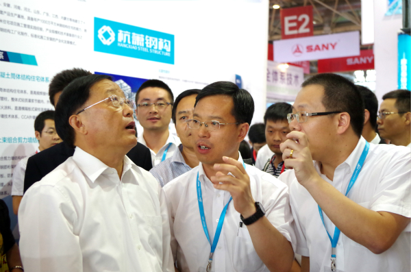住房和城鄉(xiāng)建設(shè)部部長陳政高(左一)視察杭蕭鋼構(gòu)展臺