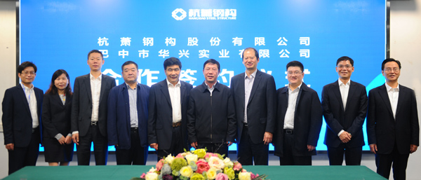 上午9:18分,杭蕭鋼構副總裁陸擁軍與華興實業(yè)有限公司董事長楊天淑共同簽署戰(zhàn)略合作協(xié)議。