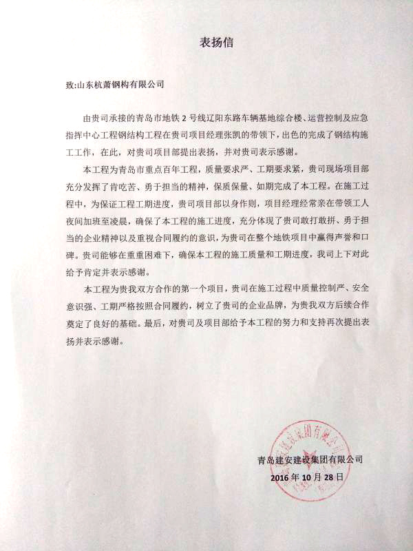 近日,由山東杭蕭鋼構(gòu)有限公司承建的青島市地鐵2號線遼陽東路車輛基地綜合樓、運(yùn)營控制及應(yīng)急指揮中心工程鋼結(jié)構(gòu)順利封頂,工程鋼結(jié)構(gòu)施工得到總包及監(jiān)理單位的一致好評,總包青島建安建設(shè)集團(tuán)有限公司在該工程完工后發(fā)來表揚(yáng)信,在信中充分感謝了山東杭蕭在工程建設(shè)中的付出和做出的貢獻(xiàn)。