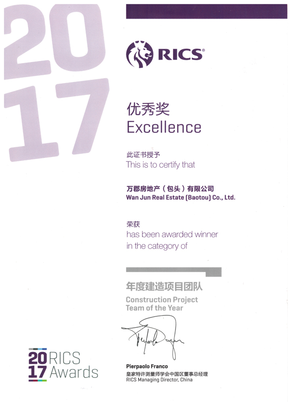 近日,RICS華東年度晚宴暨“RICS Awards,中國2017”頒獎典禮在上海隆重舉行,活動匯集了眾多房地產(chǎn)、建筑、造價等領(lǐng)域的知名專家。萬郡房地產(chǎn)(包頭)有限公司參與評審的“年度建造項目團隊”喜獲優(yōu)秀獎, RICS中國理事會主席梁士毅先生為我司頒獎。另外我司還獲得了“年度研究團隊”的入圍獎。