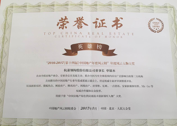 2017年1月11日,由全聯(lián)房地產(chǎn)商會(huì)、安家雜志社發(fā)起主辦的2016-2017(第十四屆)中國地產(chǎn)年度風(fēng)云榜盛典在北京人民大會(huì)堂圓滿落幕。這場旨在推動(dòng)房地產(chǎn)行業(yè)創(chuàng)新轉(zhuǎn)型的年度大會(huì),吸引了全國各地房地產(chǎn)行業(yè)及上下游產(chǎn)業(yè)的企業(yè)領(lǐng)袖、商界翹楚及專家等近2000人歡聚一堂。國內(nèi)首家鋼結(jié)構(gòu)上市公司杭蕭鋼構(gòu),作為綠色地產(chǎn)供應(yīng)鏈上的領(lǐng)軍企業(yè),受邀參加此次峰會(huì),不僅斬獲“中國房地產(chǎn)部品供應(yīng)商綠色采購十大首選品牌”、“中國房地產(chǎn)綠色鋼結(jié)構(gòu)技術(shù)創(chuàng)新功勛企業(yè)”兩大企業(yè)獎(jiǎng)項(xiàng),杭蕭鋼構(gòu)董事長單銀木還獲得“中國房地產(chǎn)綠色供應(yīng)鏈技術(shù)創(chuàng)新領(lǐng)軍人物”稱號。至此,杭蕭鋼構(gòu)成為本次峰會(huì)唯一一家獲得三項(xiàng)殊榮的鋼結(jié)構(gòu)企業(yè)。